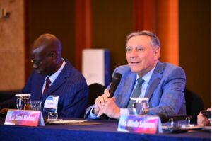 [開会の辞を述べるジェームズ・フリン GPF世界会長]