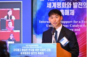 最初の発表を行ったユ・ナムシク 米州統一連帯青年プログラムディレクターは、UCLAで国際開発学と経済学をダブルメジャーで学び、学術的基盤を築いたほか、リンク(Liberty in North Korea)支部長として脱北者人権擁護活動に従事した現場経験を紹介しました。