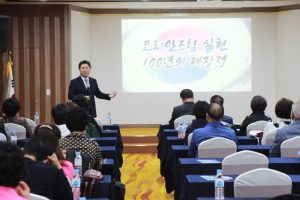 続いて、徐仁澤(ソ・インテク)AKU中央共同常任議長の特別講義が行われました。約3時間にわたる熱のこもった講義となりました。特別講義第1部「朝鮮半島統一の歴史的機会とコリアンドリーム」では朝鮮半島をめぐる国際情勢及び歴史を紹介し、第2部では「統一朝鮮半島のビジョンは何か」をテーマに弘益人間の精神を説明して、統一践士が目指すべきムーブメントを紹介しました。