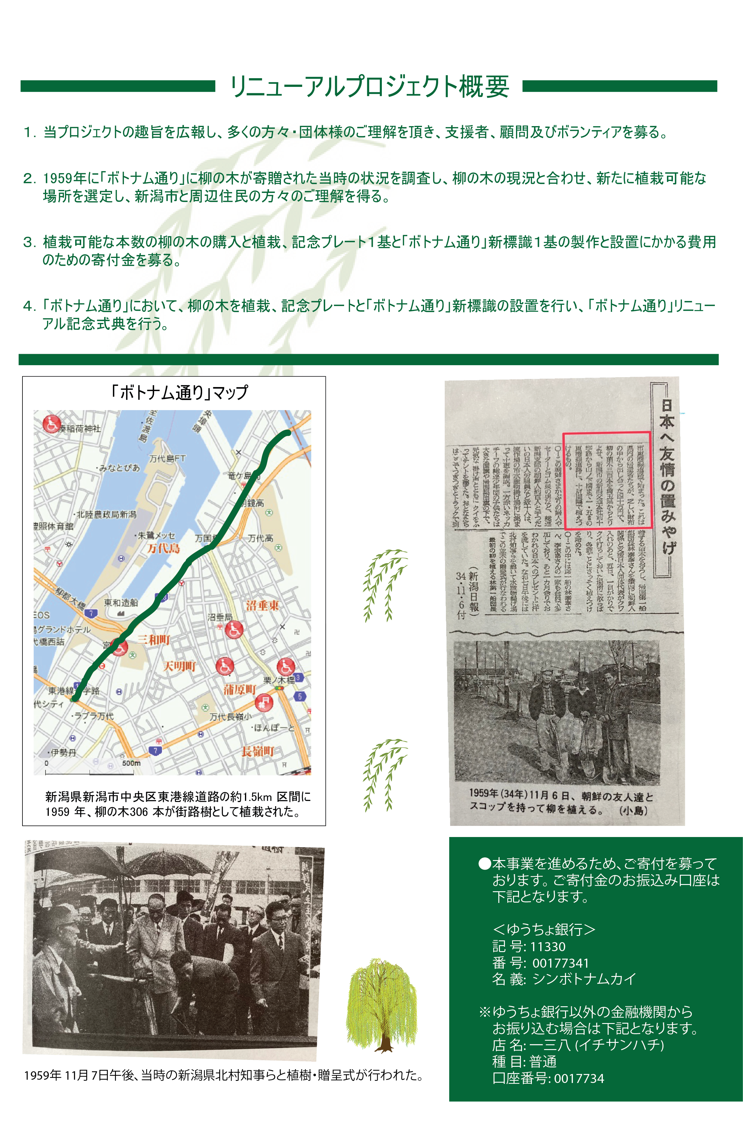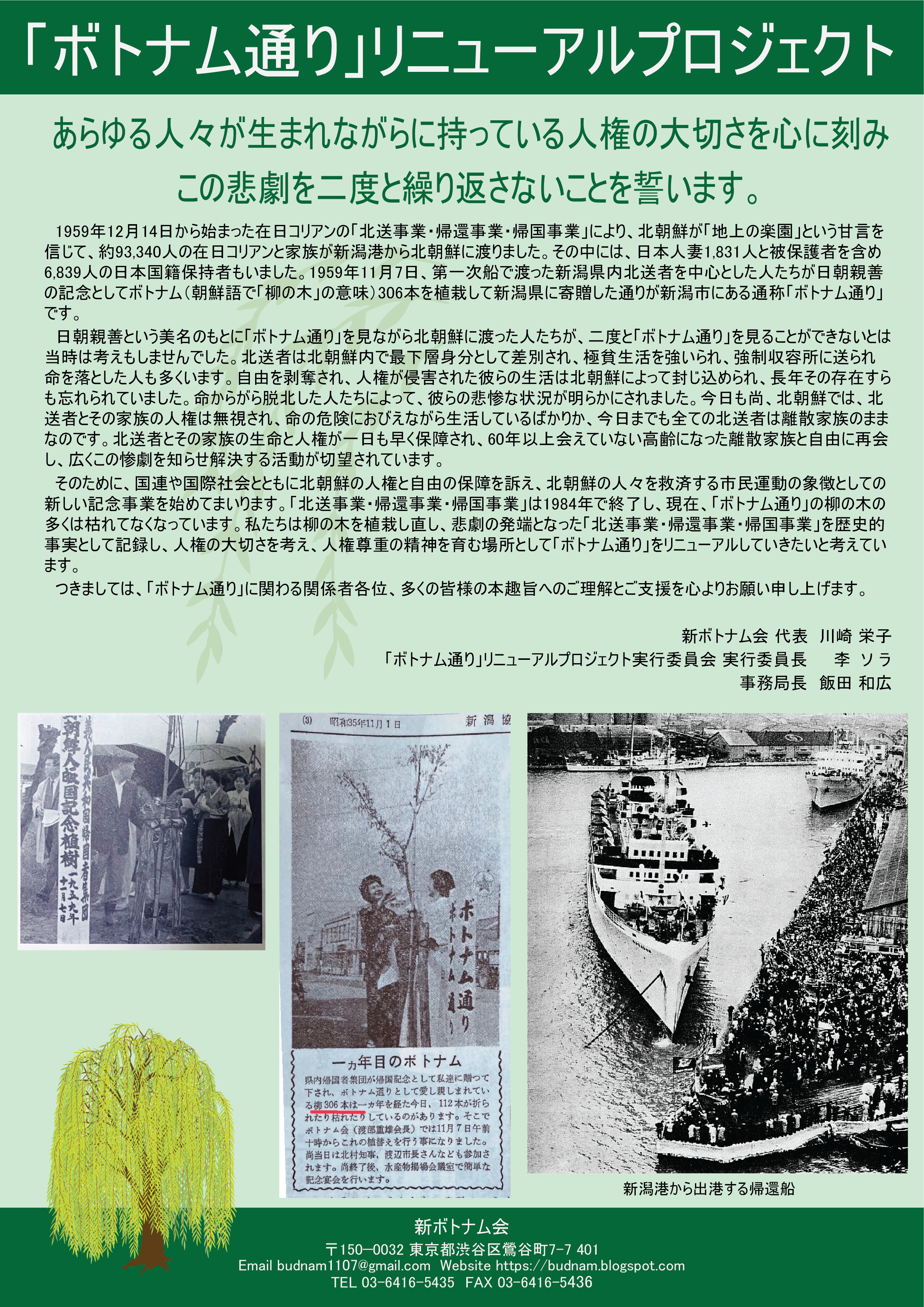 1959年11月7日、第一次船で渡った北送者と協力者が日朝親善の記念としてボトナム(朝鮮語で「柳の木」の意味)306本を新潟県に寄贈して植栽した通りが通称「ボトナム通り」であります。甚大な被害をもたらした事業の意味を顧みることはなく、柳の木の多くはなくなりました。