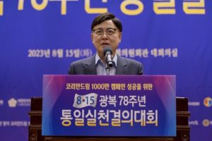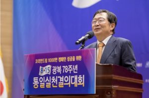 パク・スンジュ会長は祝辞で「20世紀のコリアン・ドリームが独立と産業化であったなら、21世紀のコリアン・ドリームは統一具現であり、あらゆる逆境を乗り越えて独立と産業化、民主化を成し遂げた朝鮮民族の底力で統一を実現していくと信じている」と述べました。
