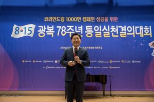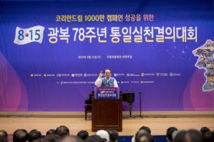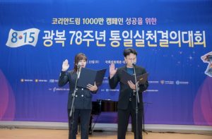 一方、事業計画発表後に行われた決議文の朗読では、南と北を代表してキム・ジョンフン全国青年連合代表とイ・ヒョンヒ南北ハナ芸術団長が「8.15光復78周年統一実践決議大会を迎え、自由統一コリア実現のための市民統一運動に主導的な参加と実践を決意する心を込めて、朝鮮民族の使命として統一を実現し、世界文明をリードする模範的な国家を実現することで第2の3.1運動を起こすという熱望で、光復80周年を迎えるコリアンドリーム1000万キャンペーンに新命を捧げていく」と抱負を述べました。