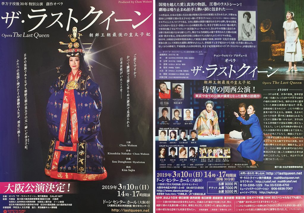 3月に大阪で公演したオペラ、ラストクイーン(朝鮮王朝最後の皇太子妃)のポスター(公式ホームページ www.lastqueen.net)
